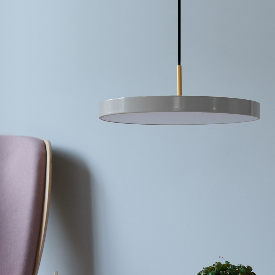 Asteria pendlen fra danske UMAGE forener enkelthed, teknologi og godt håndværk i et tidløst design. Det slanke, specialdesignede LED-panel giver lampen et minimalistisk udtryk, der aldrig går af mode. Panelet kan dæmpes med en ekstern lysdæmper, og diffuseren sikrer en blød og behagelig belysning i rummet. Pendlen fås i to størrelser og hele 11 farver. Den elegante top kan desuden nemt udskiftes til enten messing, stål eller sort på få minutter, hvilket giver dig et fleksibelt design, der kan tilpasses din personlige stil.