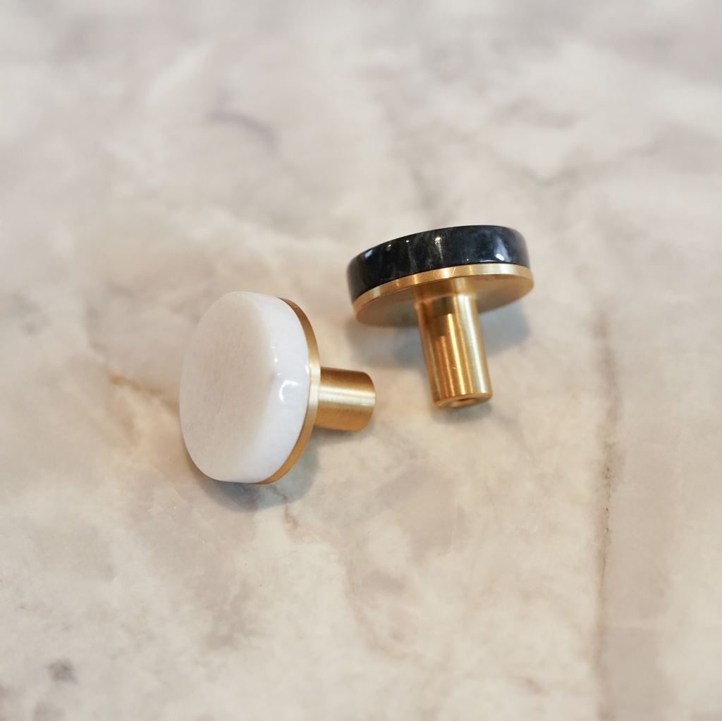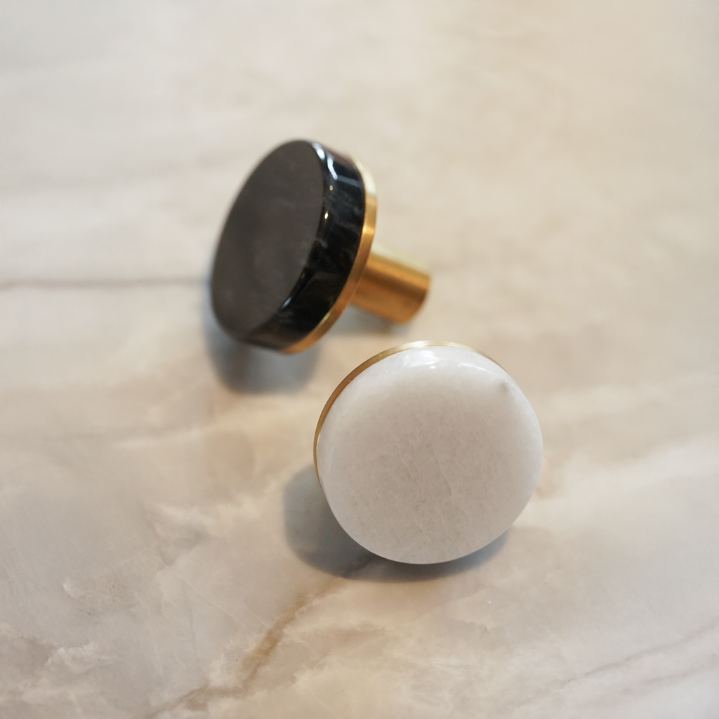 Knoppen er fremstillet i marmor og massiv børstet messing, som er et yderst stærkt materiale. Denne knop er med lak, som beskytter produktet mod patinering og sørger for, at det holder sin ensartede overflade i lang tid.