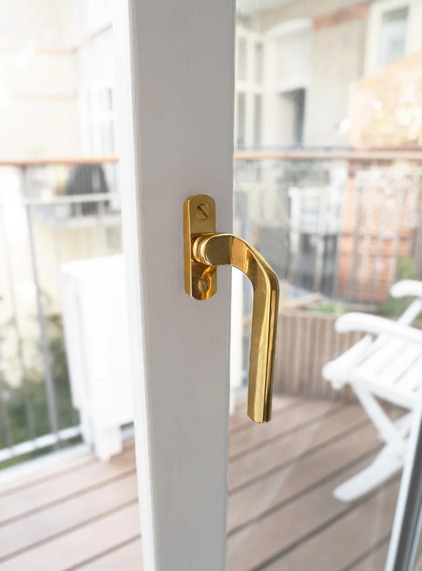 Vinduesgrebet er fremstillet i poleret massiv messing uden lak, hvilket betyder ar det vil patinere smukt over tid.